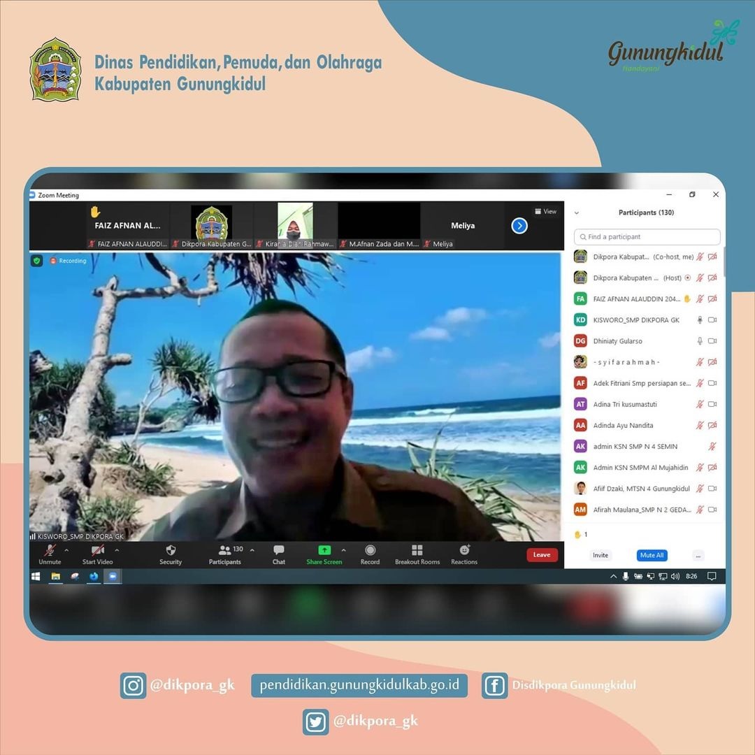 WONOSARI - Dinas Pendidikan, Pemuda, dan Olahraga Kabupaten Gunungkidul melalui bidang SMP mengadakan pembekalan kepada siswa-siswi SMP/MTs se-kabupaten Gunungkidul tanggal 6 sd 8 September 2021 melalui media daring. Peserta berjumlah 123 siswa baik dari SMP maupun MTs negeri dan swasta. Narasumber diambil dari kalangan praktisi yang sudah berpengalaman membimbing KSN baik tingkat regional maupun nasional. Sedangkan dari kalangan akademisi dari UNY, UPY dan LPMP.